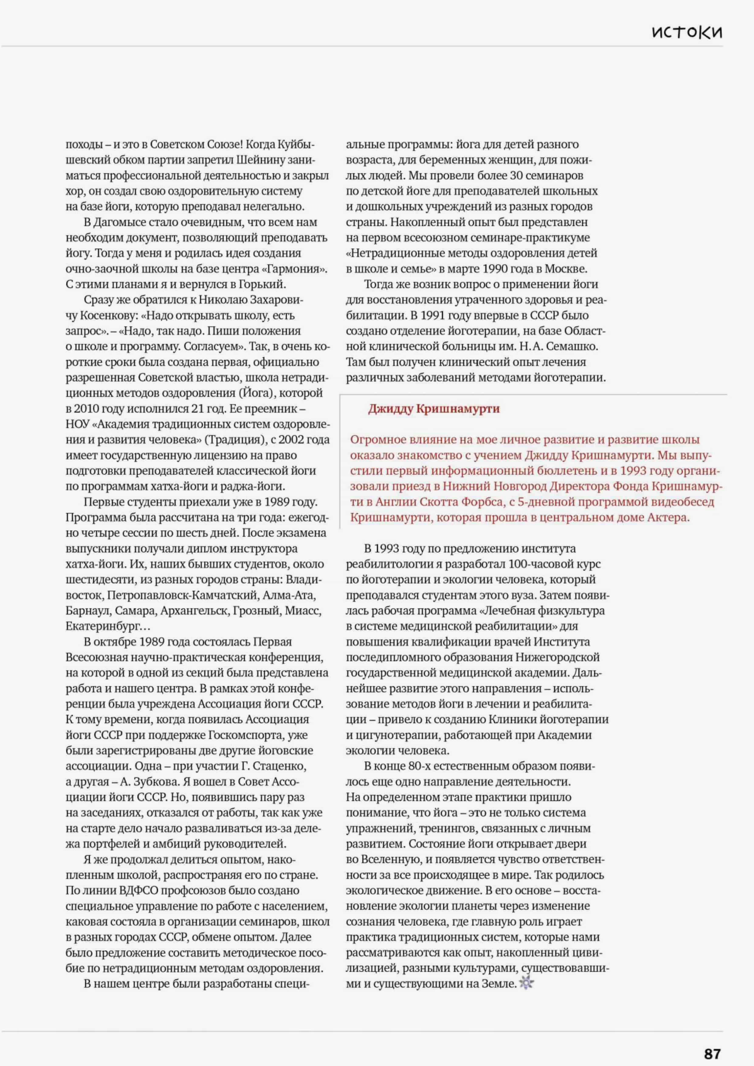 Огромное влияние на мое личное развитие и развитие школы оказало знакомство с учением Джидду Кришнамурти. Мы выпустили первый информационный бюллетень и в 1993 году организовали приезд в Нижний Новгород директора Фонда Кришнамурти в Англии Скотта Форбса, с 5-дневной программой видеобесед Кришнамурти, которая прошла в Центральном доме актера.