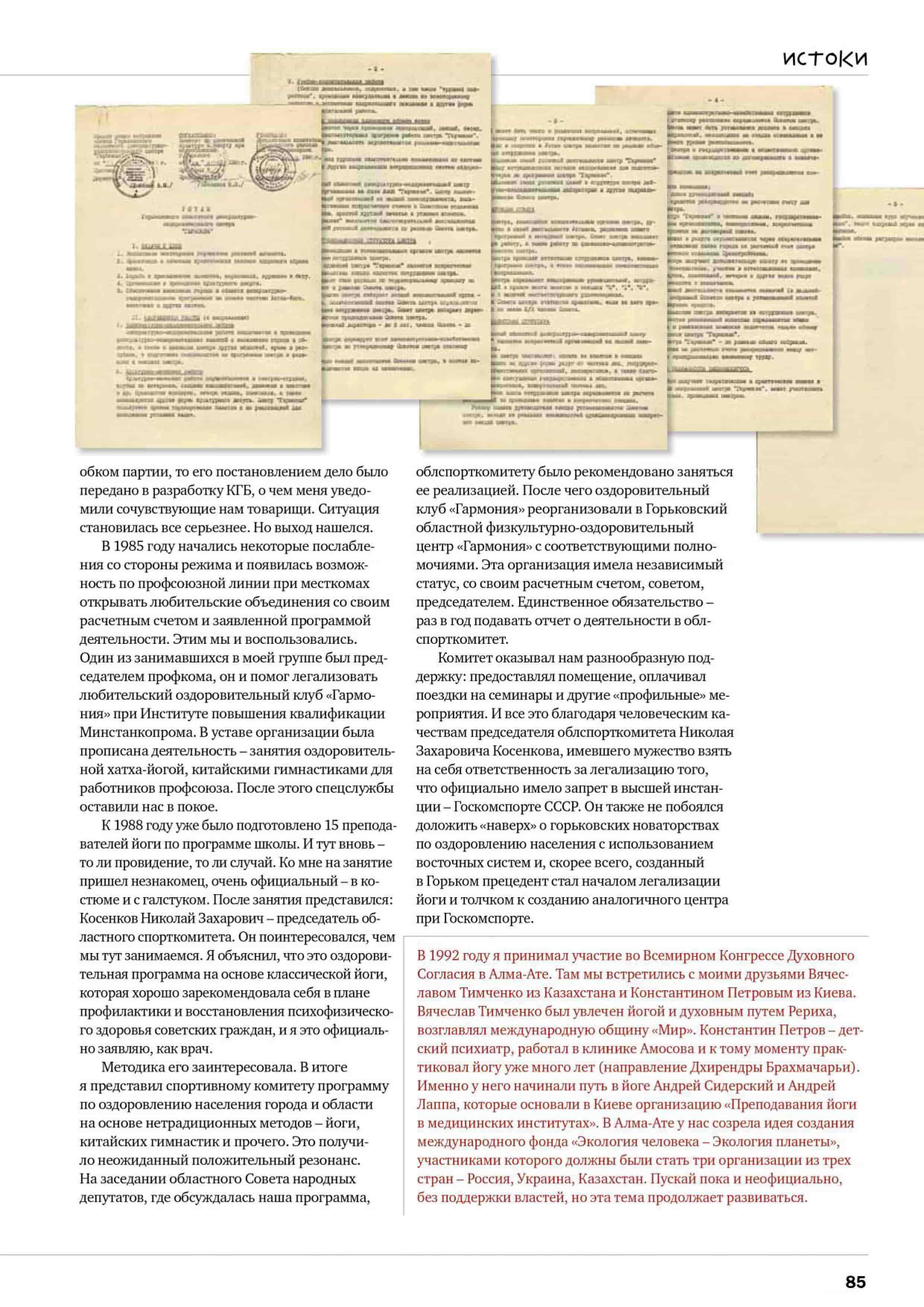 Мы же в своей «социальной наглости» пошли еще дальше. По нашей инициативе была создана комиссия, состоящая из руководства спорткомитета, экспертов (заведующих кафедрами физкультурных институтов, Горьковского медицинского института) и общественности для аттестации преподавателей центра «Гармония». В итоге в 1988 году в СССР появились первые 15 «легальных» инструкторов хатха-йоги с удостоверениями, выданными горьковским облспорткомитетом. Почти сразу же были открыты 17 групп в разных районах города. К 1989 году их уже было 24.