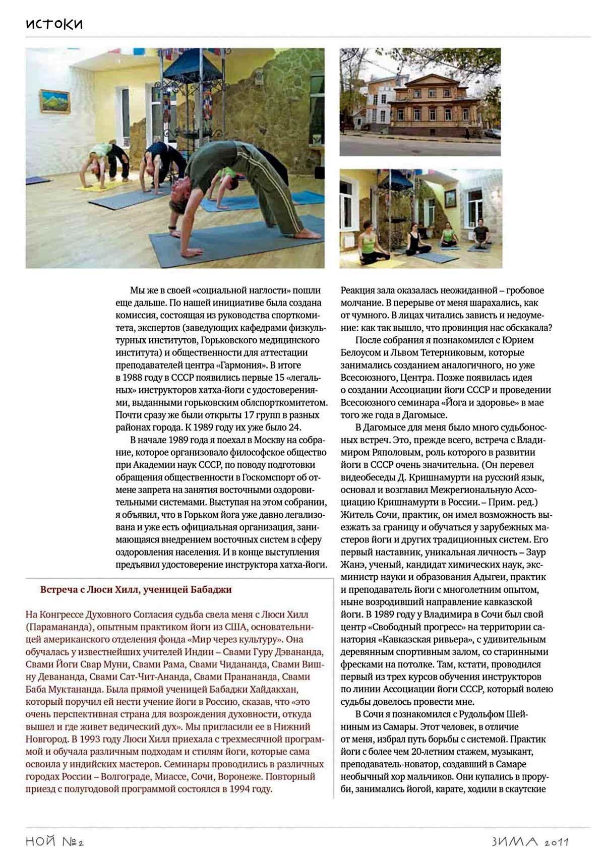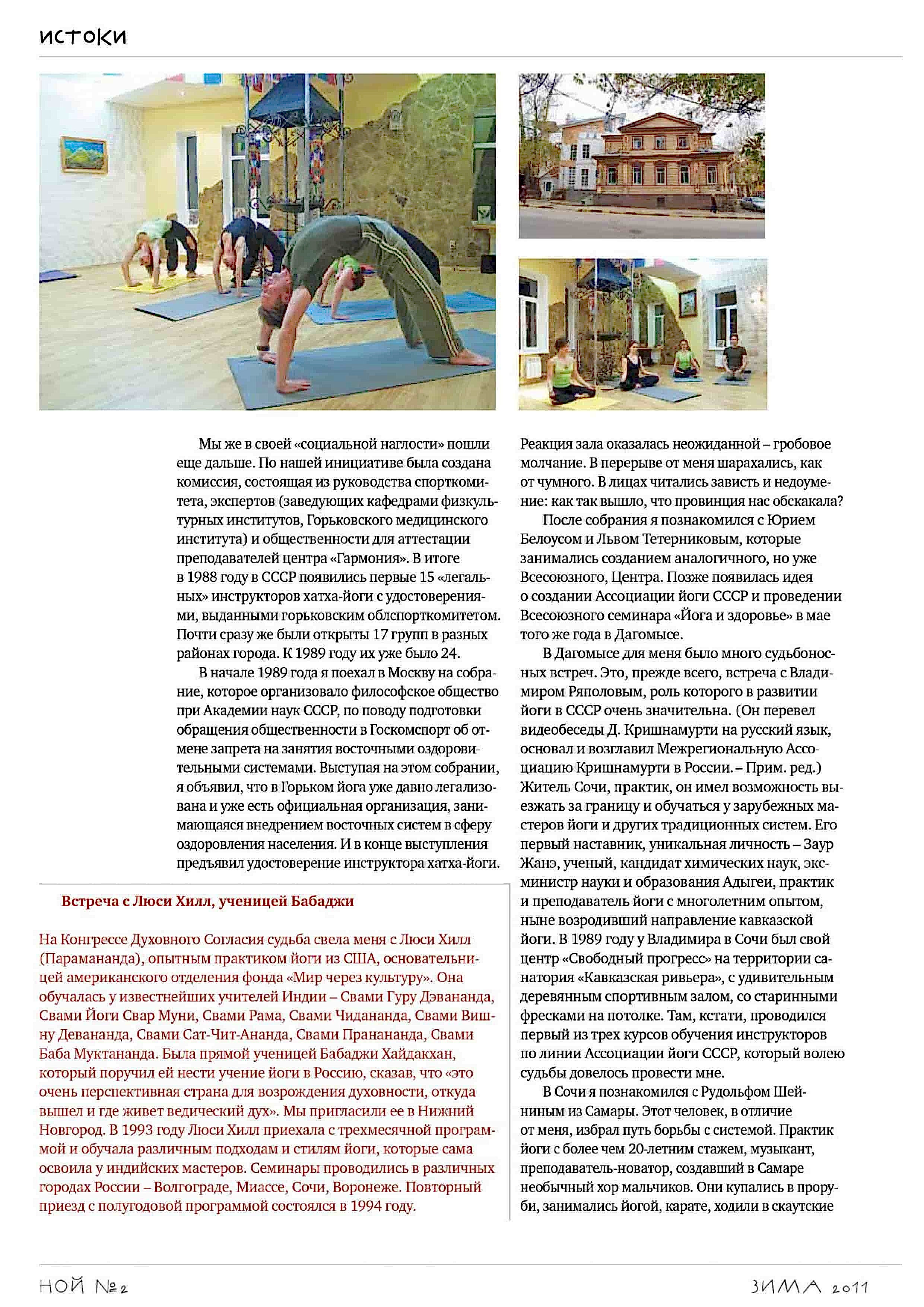 На Конгрессе Духовного Согласия судьба свела меня с Люси Хилл (Парамананда), опытным практиком йоги из США, основательницей американского отделения фонда «Мир через культуру». Она обучалась у известнейших учителей Индии – Свами Гуру Дэвананда, Свами Йоги Свар Муни, Свами Рама, Свами Чидананда, Свами Вишну Девананда, Свами Сат-Чит-Ананда, Сваим Пранананда, Свами Баба Муктананда. Была прямой ученицей Бабаджи Хайдакхан, который поручил ей нести учение йоги в Россию, сказав, что «это очень перспективная страна для возрождения духовности, откуда вышел и где живет ведический дух». Мы пригласили ее в Нижний Новгород. В 1993 году Люси Хилл приехала с трехмесячной программой и обучала различным подходам и стилям йоги, которые сама освоила у индийских мастеров. Семинары проводились в различных городах России – Волгограде, Миассе, Сочи, Воронеже. Повторный приезд с полугодовой программой состоялся в 1994 году.