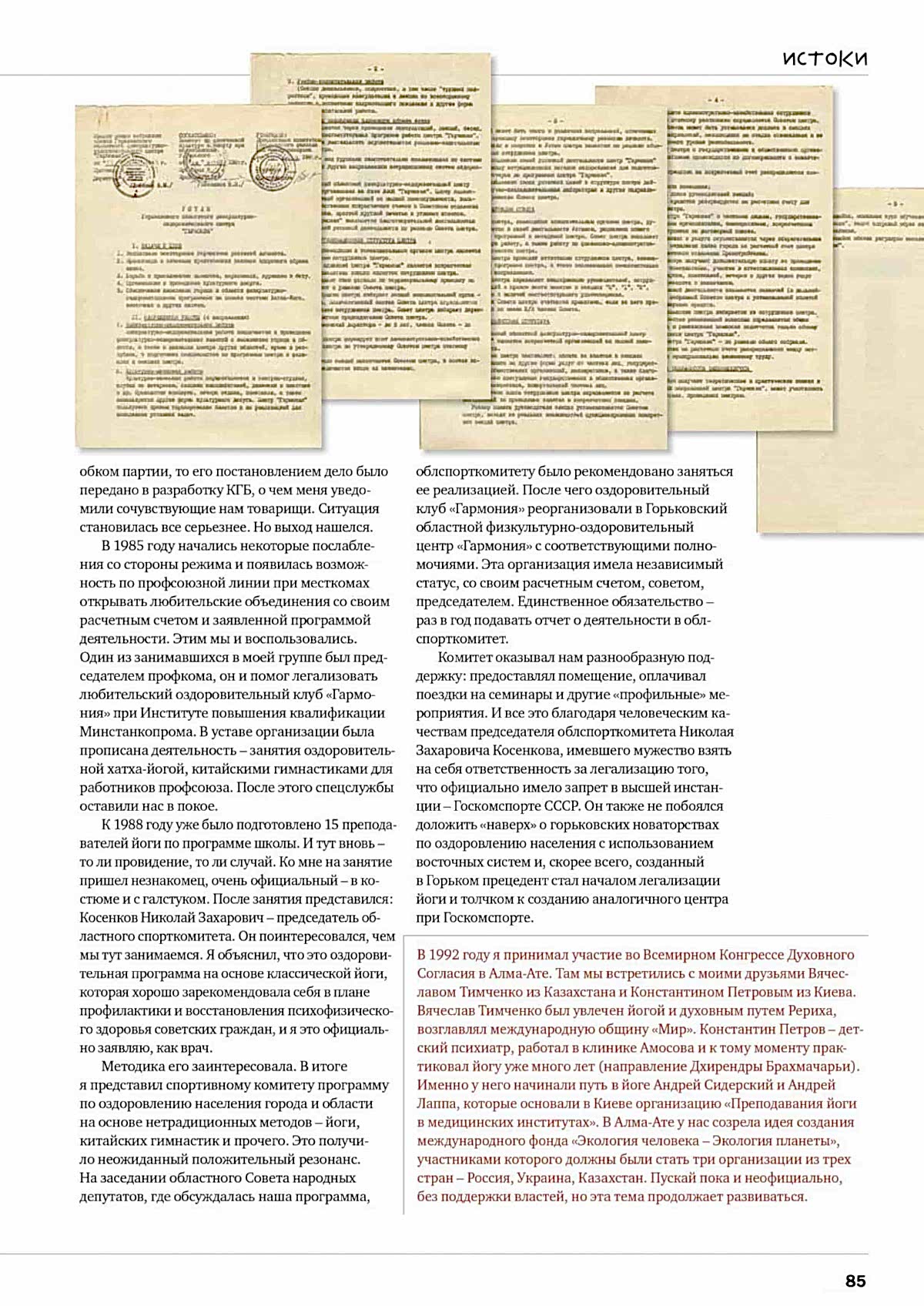 К 1988 году уже было подготовлено 15 преподавателей йоги по программе школы. И тут вновь — то ли провидение, то ли случай. Ко мне на занятие пришел незнакомец, очень официальный — в костюме и с галстуком. После занятия представился: Косенков Николай Захарович — председатель областного спорткомитета. Он поинтересовался, чем мы тут занимаемся. Я объяснил, что это оздоровительная программа на основе классической йоги, которая хорошо зарекомендовала себя в плане профилактики и восстановления психофизического здоровья советских граждан, и я это официально заявляю, как врач.