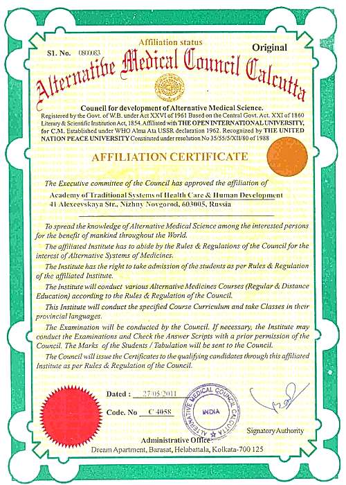 Alternative Medical Council Calcutta, основанный в 1991 году, уже более 20 лет занимается подготовкой профессиональных кадров в области альтернативной медицины. В его образовательную программу входит около 100 сертифицированных курсов продолжительностью от года до 3х лет с выдачей документов — дипломов, сертификатов, удостоверений.