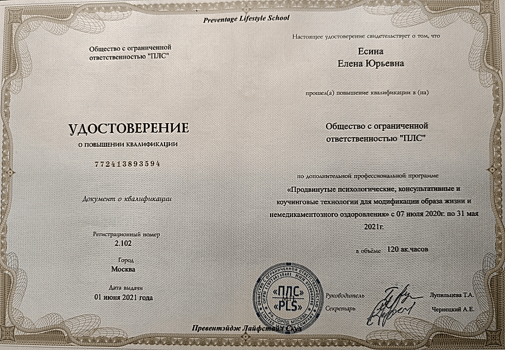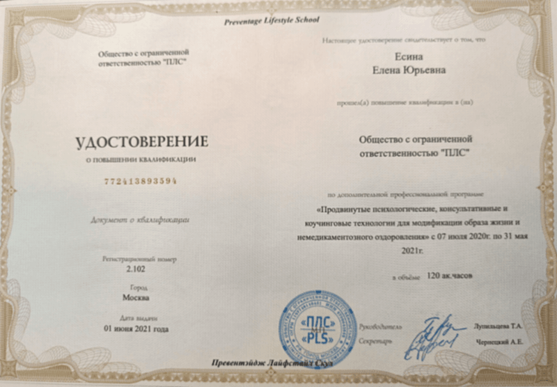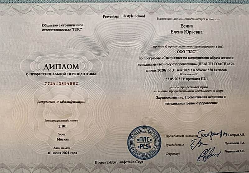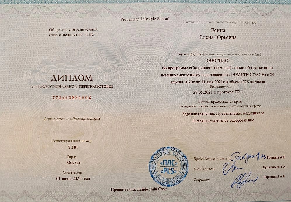 2021 г. - «PreventAge» Международный институт интегральной превентивной и антивозрастной медицины, «Специалист по модификации здорового образа жизни».