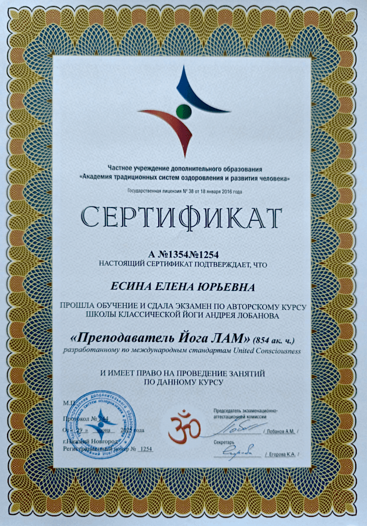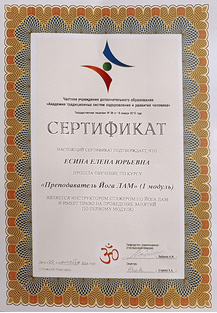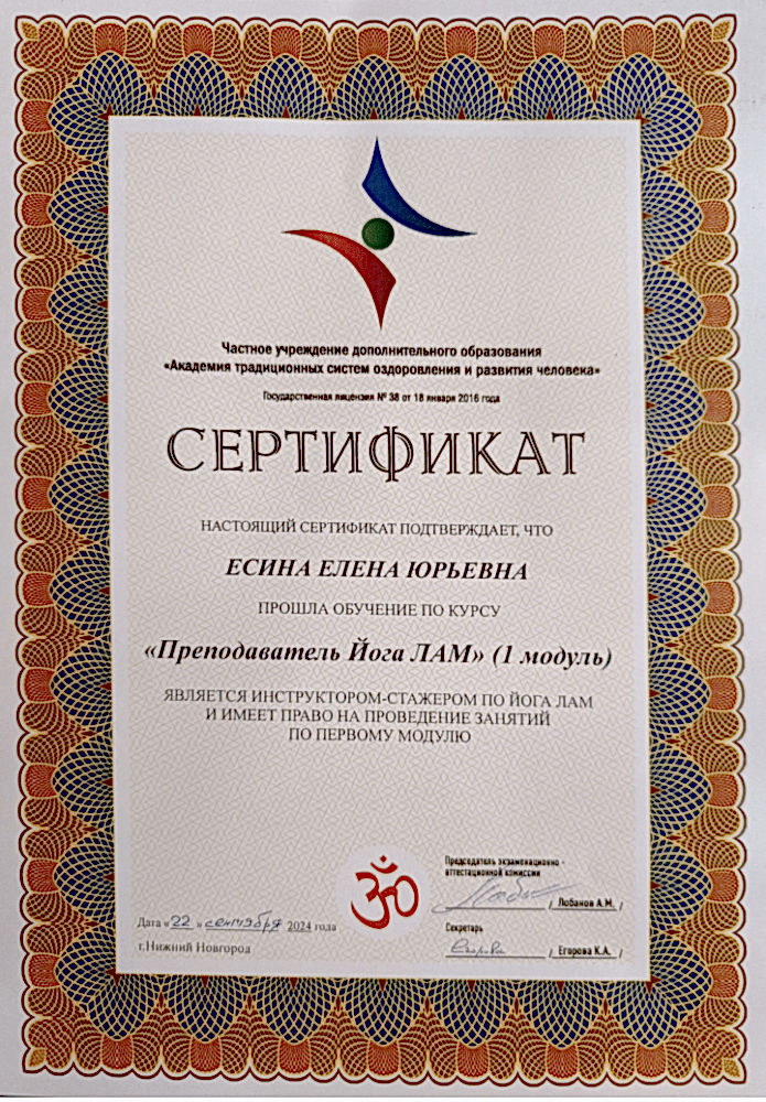 2023 г. - «Академия традиционных систем оздоровления и развития человека», курс «Преподаватель Йога ЛАМ»