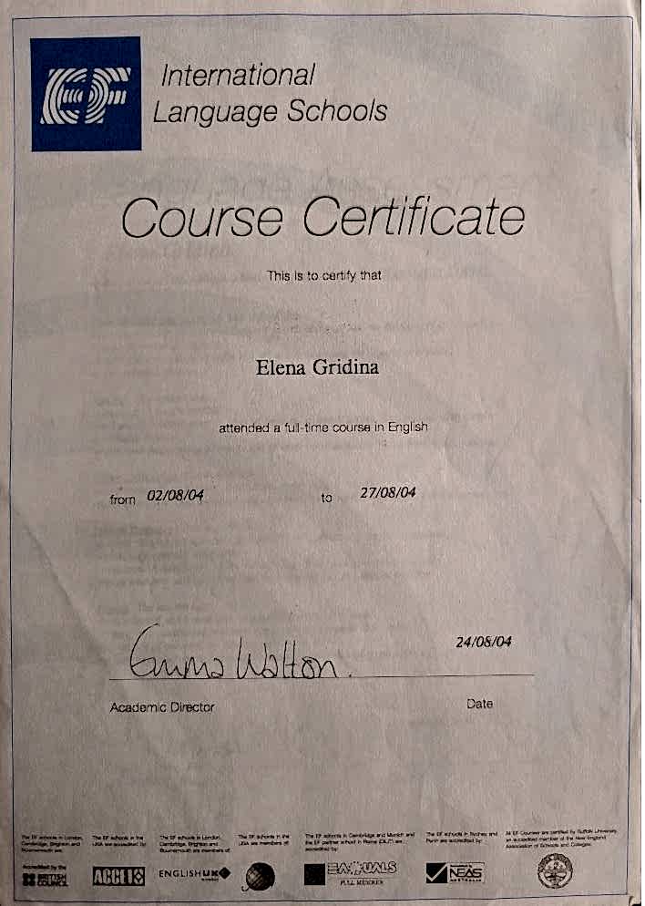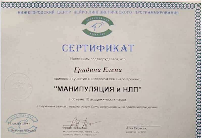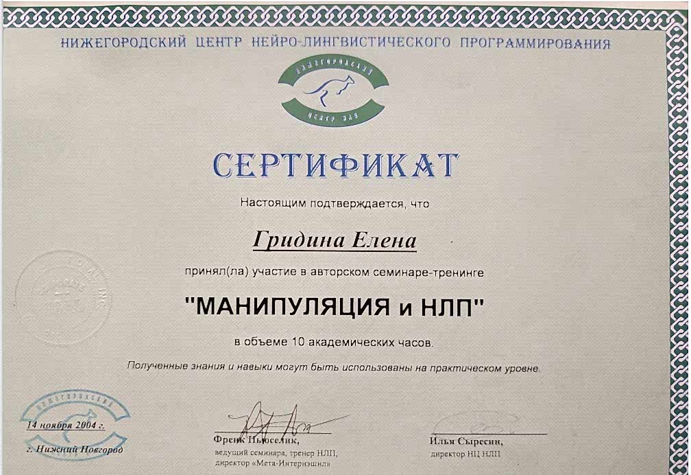 2004 г. - Нижегородский Центр Нейро-Лингвистического Программирования. Курс по международной программе «Practitioner of NLP».