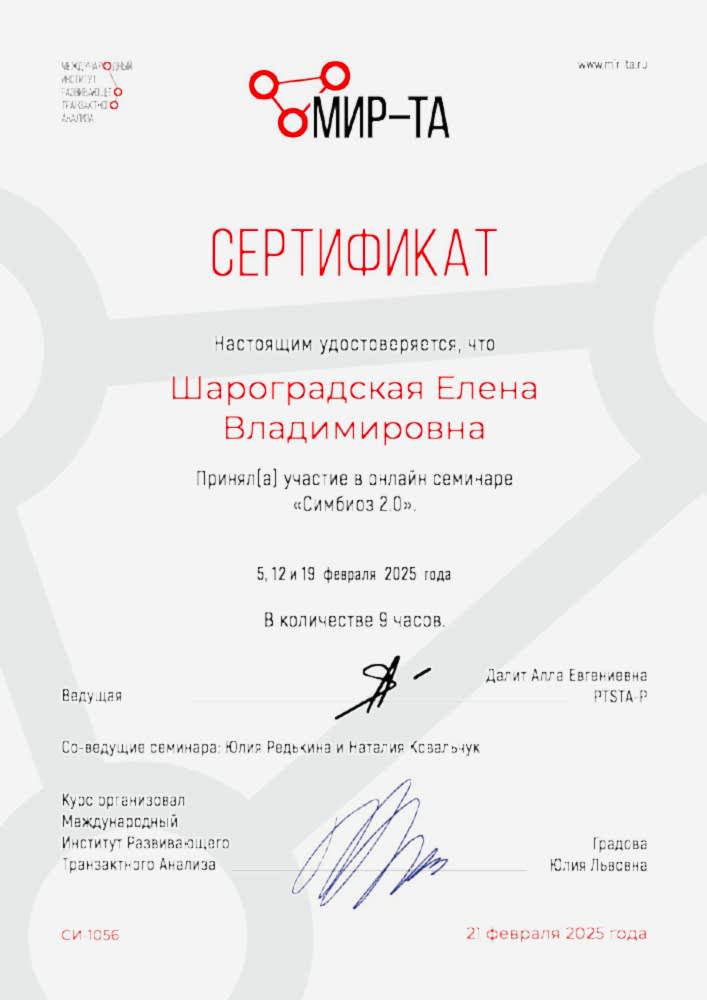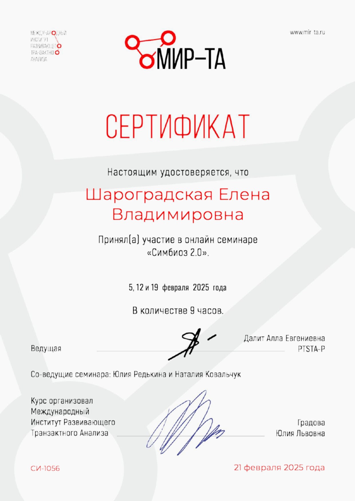- Повышение квалификации: “Паталогический симбиоз. Проблемы сепарации, ТА подход”, ( “Международный институт развивающего тразактного анализа”, 2025 г.)