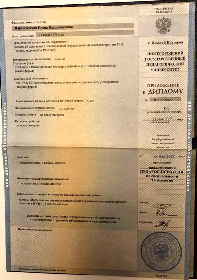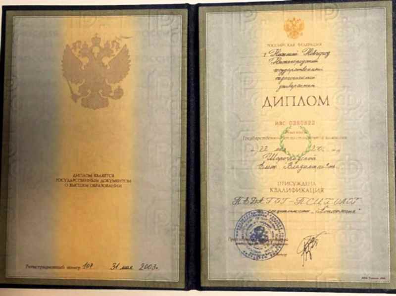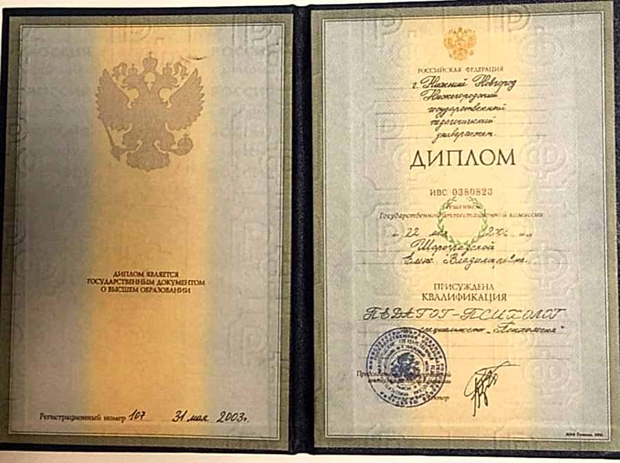 - НГПУ, специальность “Психология”, квалификация “Педагог- психолог”, 2003 г.
