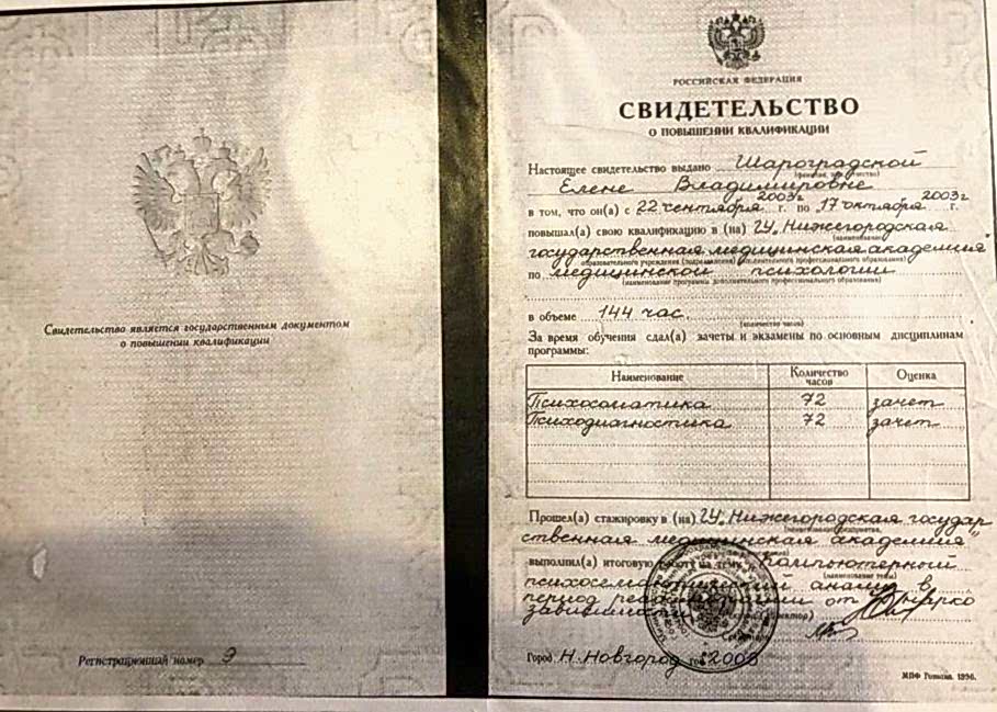 - Повышение квалификации: “Медицинская психология”, квалификация медицинский психолог, (ГУ НГМА, 2003 г.).