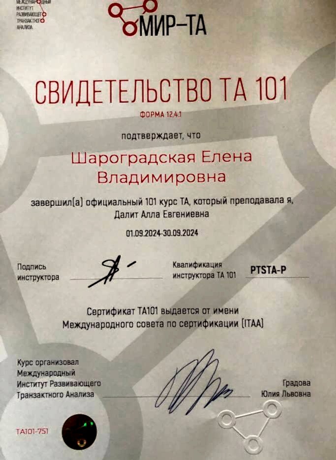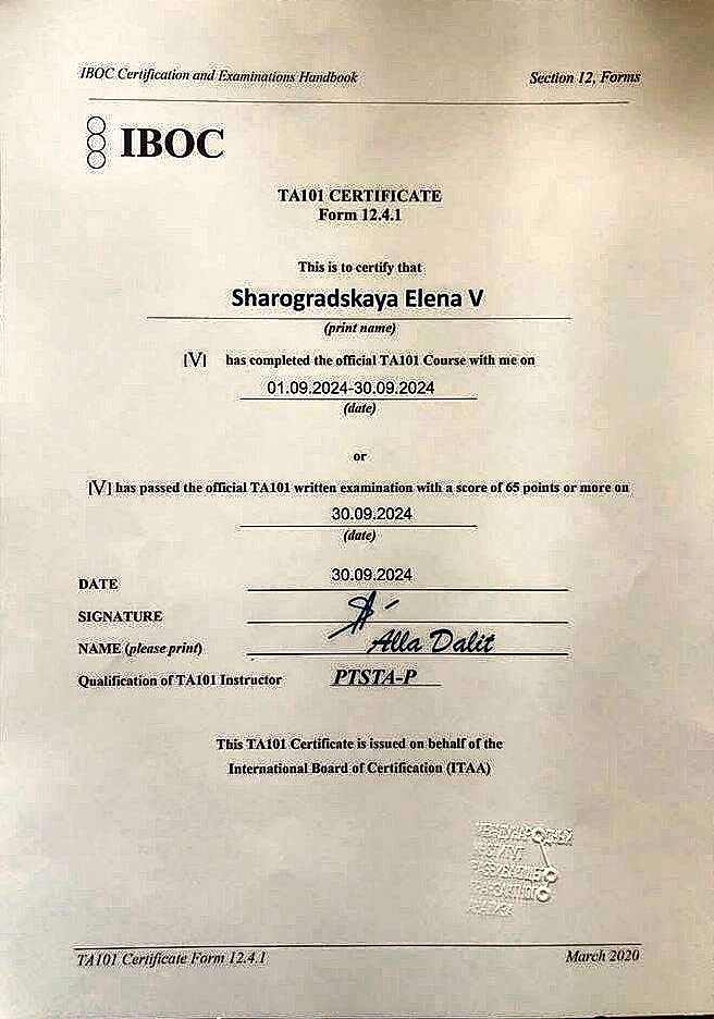 - Повышение квалификации: “Базовый уровень. Транзактный анализ в консультировании и психотерапии” (ТА 202), (“Международный институт развивающего тразактного анализа”, 2024-2025 гг. )