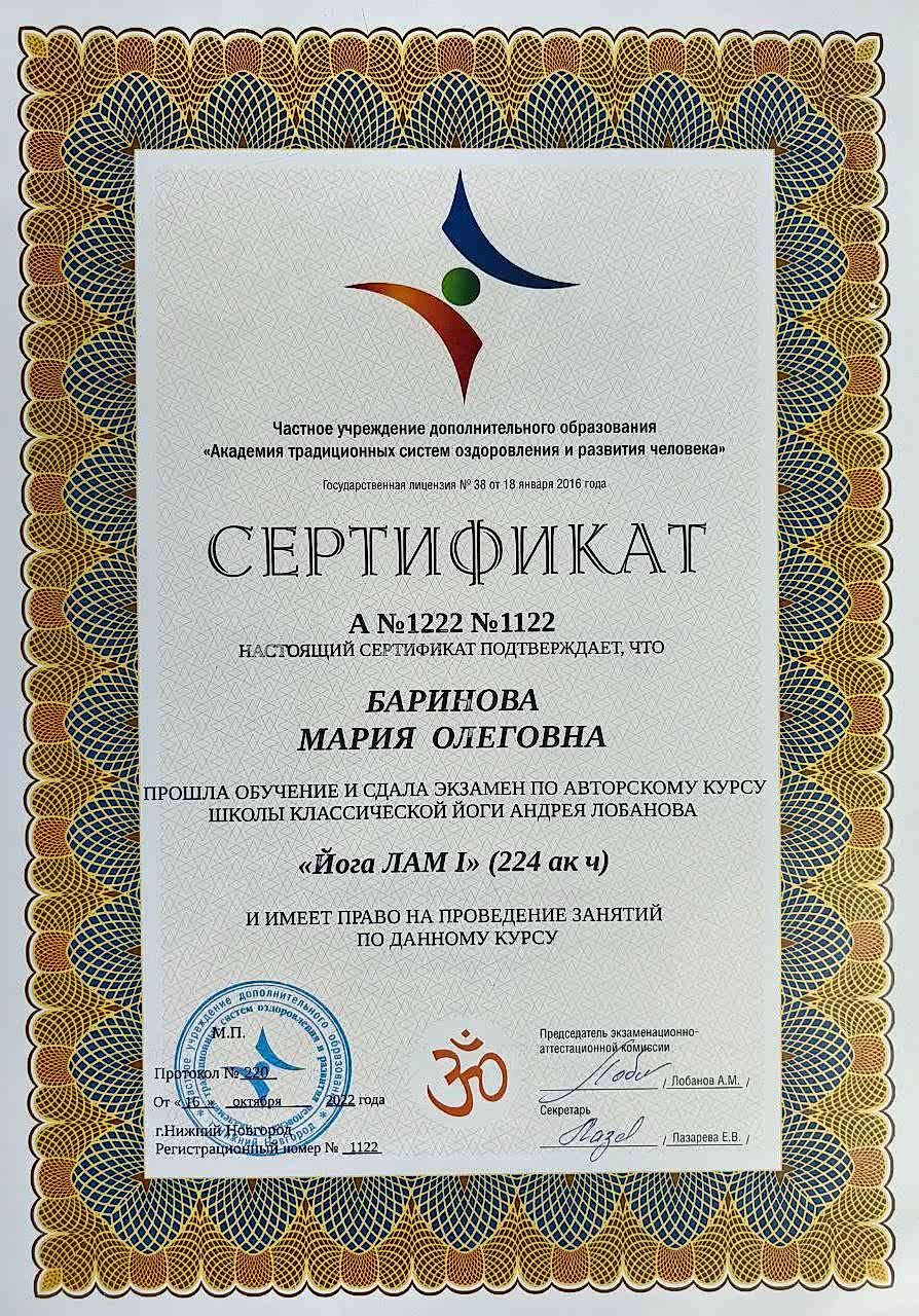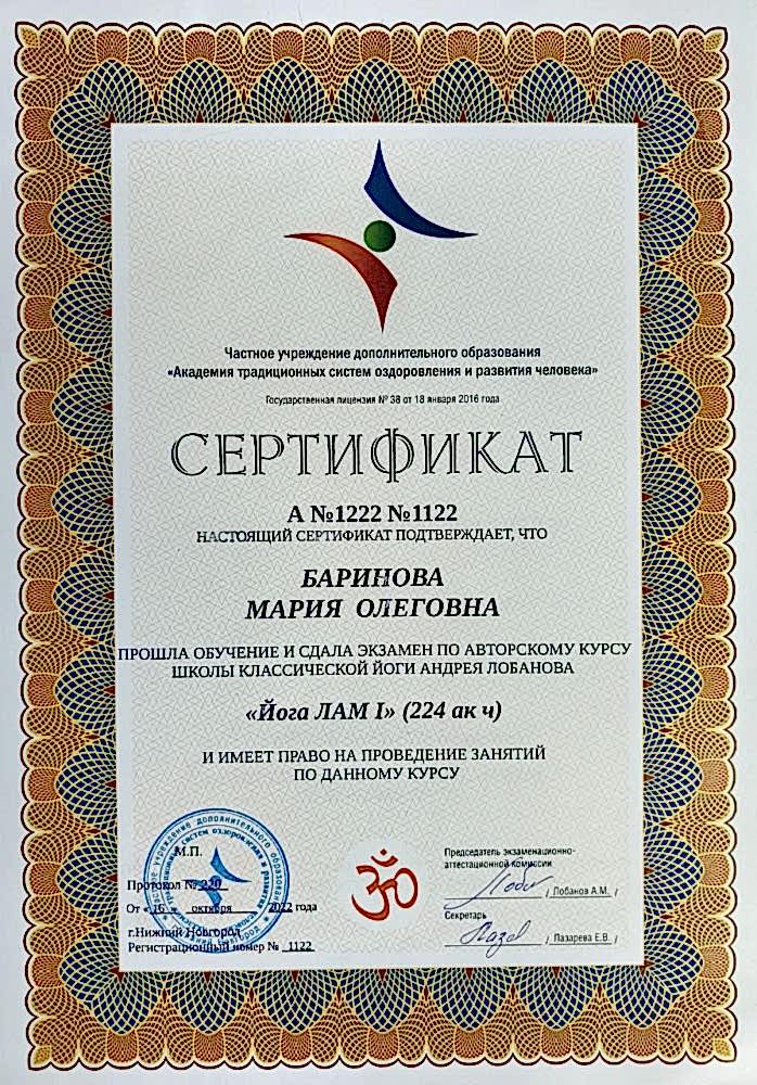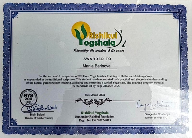 в 2023 г. - прошла сертификацию Йога Альянса (школа Ришикул Йогшала, г. Ришикеш) в качестве инструктора хатха йоги.