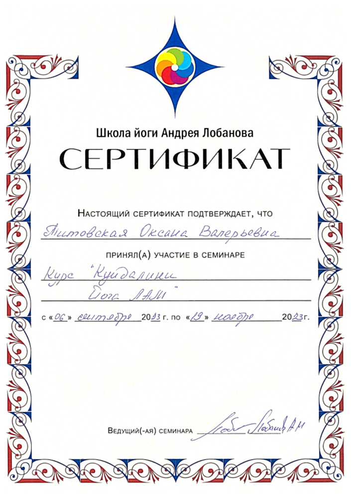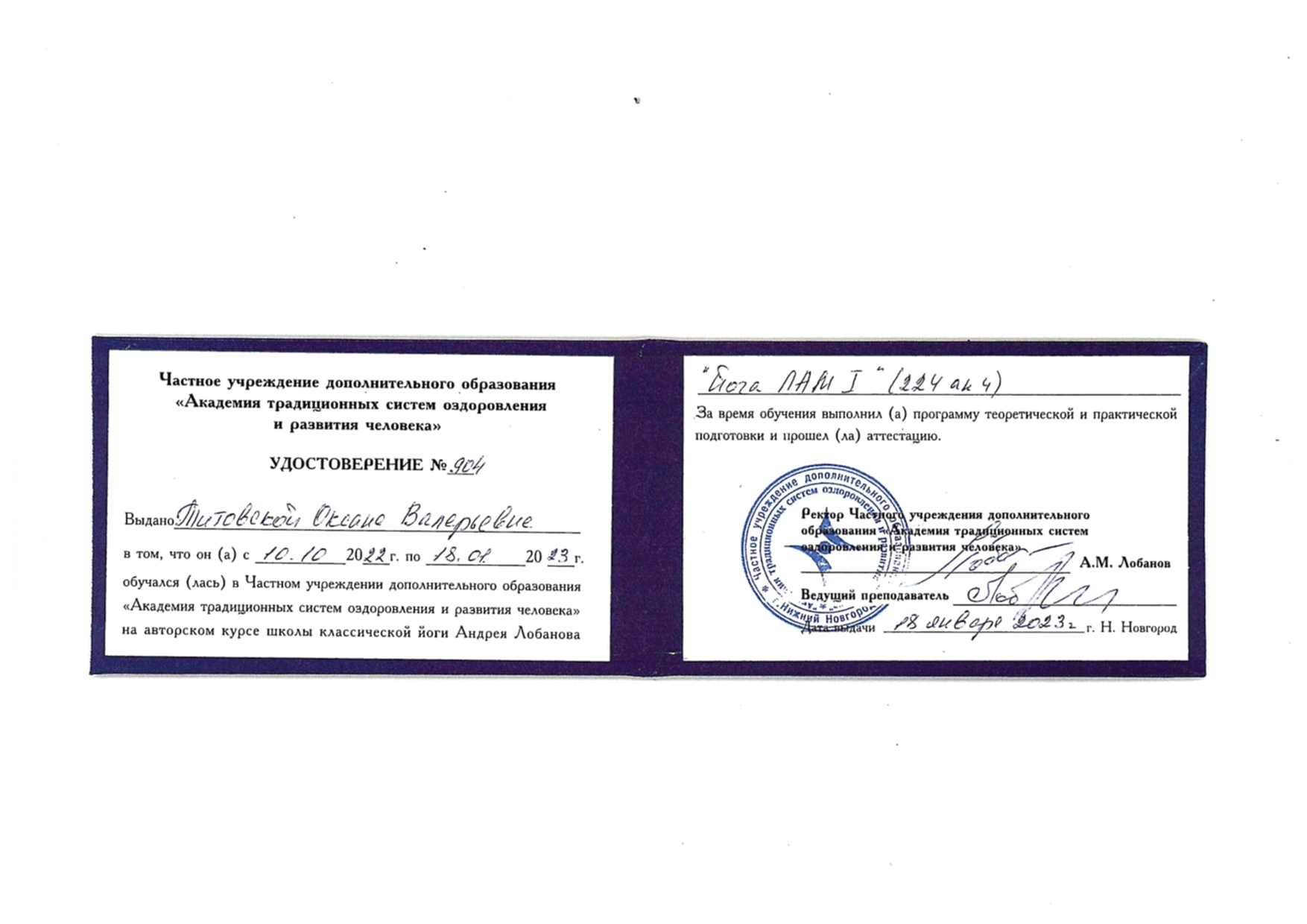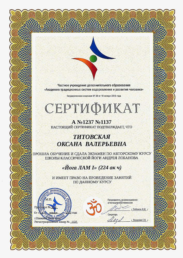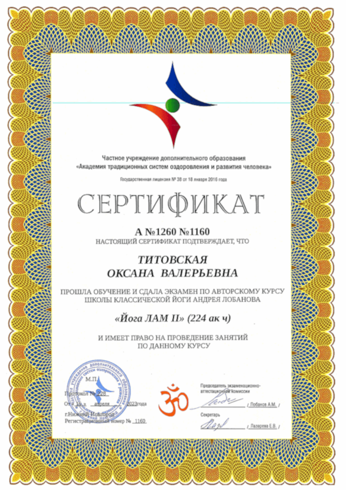 В 2022г и 2023 г. прошла обучение в «Академии традиционных систем оздоровления и развития человека» по авторским курсам «Йога ЛАМ I» и «Йога ЛАМ II».