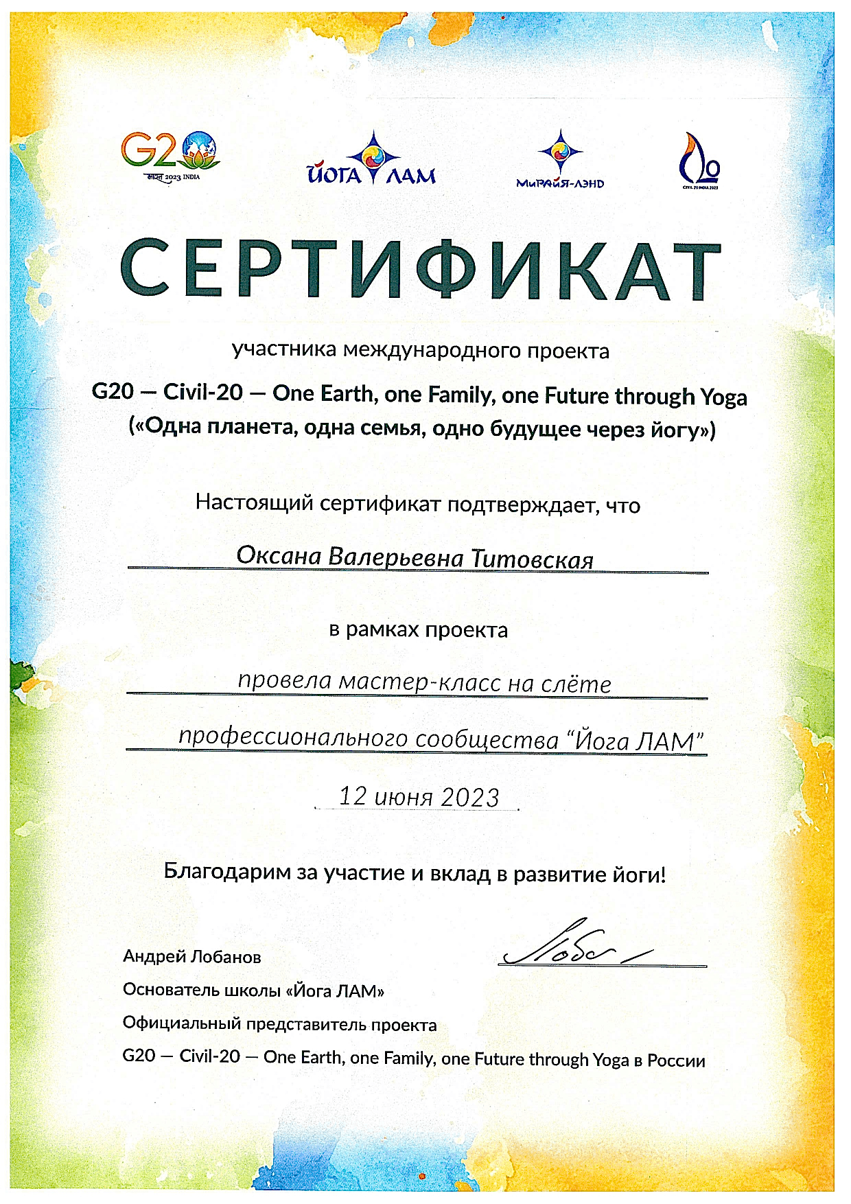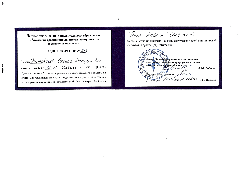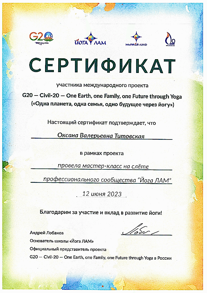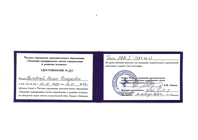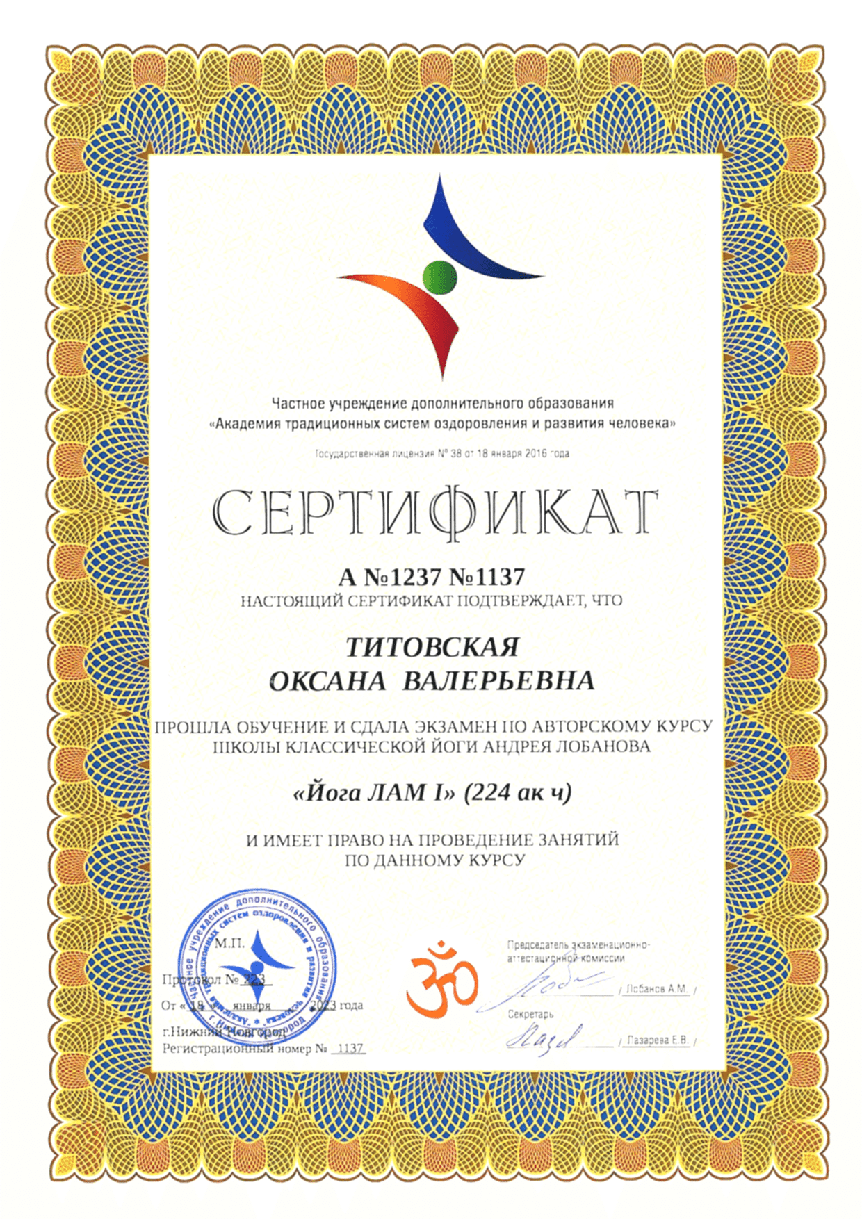 В 2022г и 2023 г. прошла обучение в «Академии традиционных систем оздоровления и развития человека» по авторским курсам «Йога ЛАМ I» и «Йога ЛАМ II».