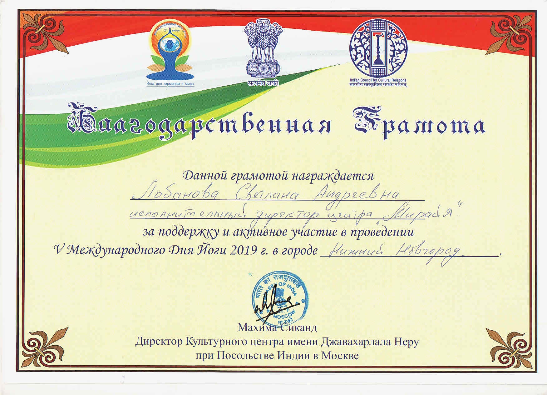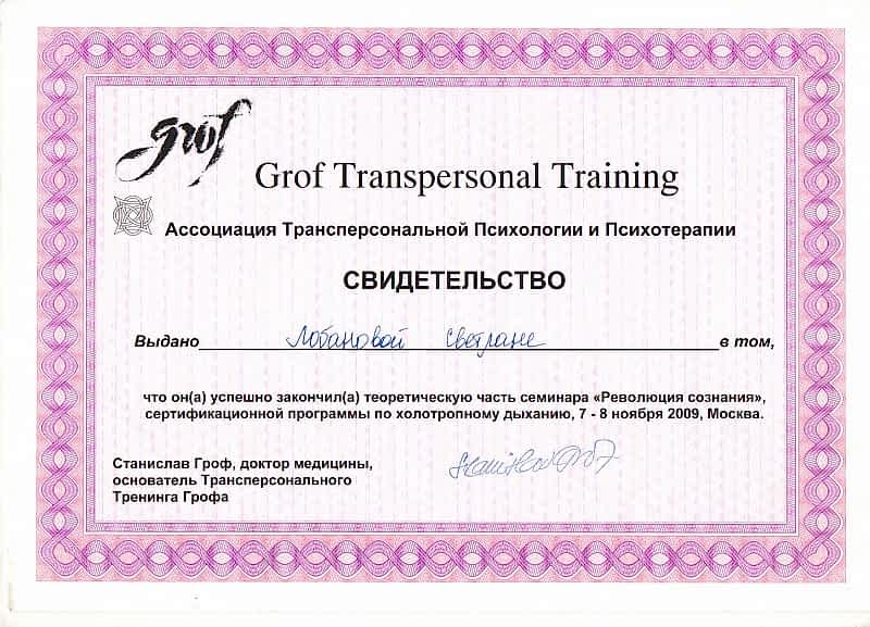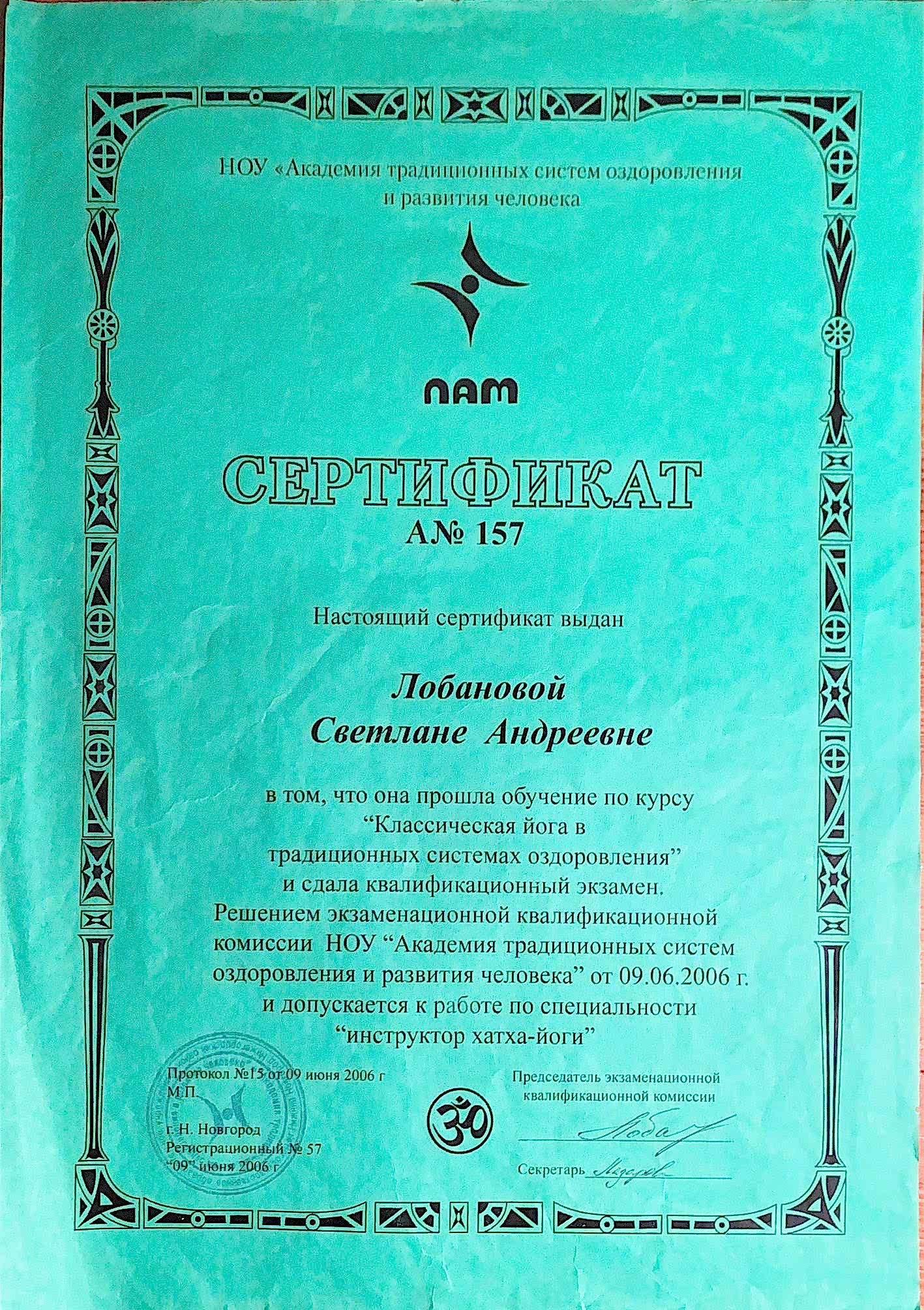 - «Классическая йога в традиционных системах оздоровления. Хатха-йога» (2006) с присвоением квалификации инструктора хатха-йоги;