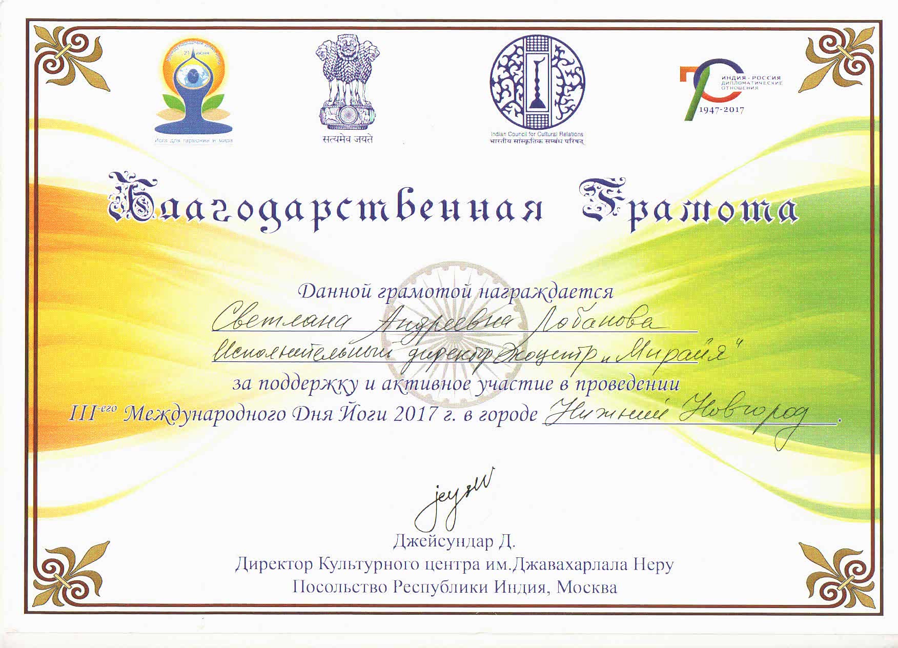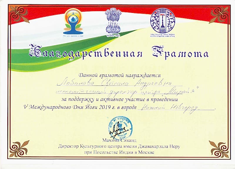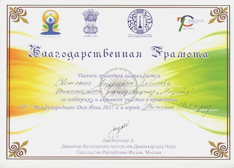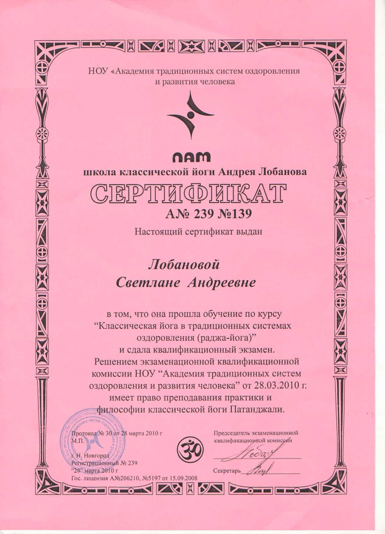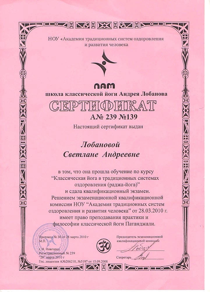 - «Классическая йога в традиционных системах оздоровления. Раджа-йога» (2010), получив право преподавания практики и философии классической йоги;